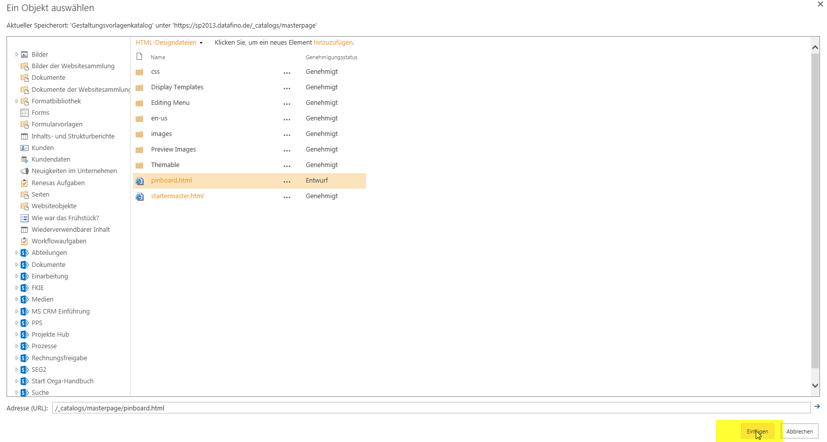 Zum Schluss benenne ich die Datei index.html in pinboard.html um und kopiere diese, ebenfalls über den Explorer, in den Ordner _catalogs/masterpage auf dem SharePoint Server.