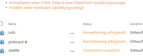 Klicken Sie in der linken Navigation auf den Punkt Gestaltungsvorlagen bearbeiten und dort auf den Punkt Konvertieren einer HTML-Datei in eine SharePoint-Gestaltungsvorlage.