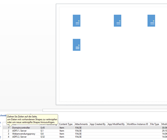 Ziehen Sie jetzt die jeweiligen Listeneinträge auf die jeweiligen Serversymbole. Damit wären die Shapes schon mit den SharePoint Daten verbunden. Um jetzt noch Farbe ins Spiel zu bringen, markieren Sie alle Server Shapes und klicken Sie im Menüband Daten auf Datengrafiken und wählen Sie Neue Datengrafik erstellen.