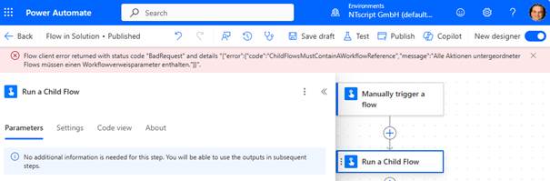 If a flow is outside of a solution and you try to start another flow, this is associated with a lot of effort or even completely impossible. If the flow is in a solution, there is a corresponding action for it. We can find this action, called Run a Child Flow, in the Flows group. This is the only action there.