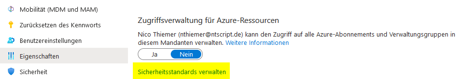 Was bedeutet dies konkret? Die Sicherheitsstandards sind schon eine relativ alte Funktion im Azure Active Directory. Sie sind im Azure Active Directory etwas versteckt unter Eigenschaften und dann ganz unten der Link Sicherheitsstandards verwalten.