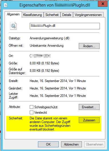 Noch ein Hinweis zum Schluß: Wenn man die Assembly via E-Mail auf dem Liveserver kopiert, so wie ich es gemacht habe, kann diese zuerst nicht registriert werden. .NET ist der Meinung, solcher Code ist unsicher und erlaubt die Aufführung nicht. Dies kann behoben werden, indem man sich im Dateisystem die Eigenschaften der Datei anzeigen lässt und die Ausführung zulässt.