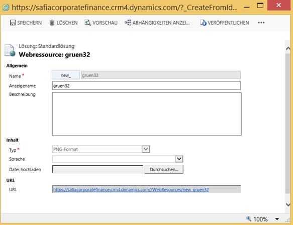 Gehen Sie zu der Lösung Firma und klicken Sie links im Baum auf Webressourcen. Klicken Sie auf Neu und geben Sie der Ressource den Namen OeffneFreigabe, als Typ wählen Sie Script und laden die Datei hoch, welche wir gerade erstellt haben. Speichern und veröffentlichen Sie die Lösung.
