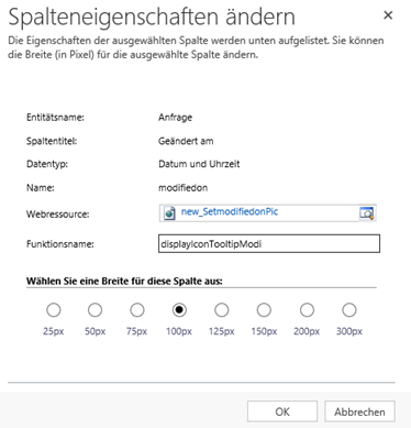Das eigentliche JavaScript finden Sie unten. Erstellen Sie damit zuerst eine Webressource vom Typ JavaScript. Gehen Sie danach zur Verwaltung ihrer Ansicht (in System anpassen) und öffnen Sie diese. Klicken Sie auf die Spalte, welche Sie anpassen möchten und dann auf Eigenschaften ändern.
