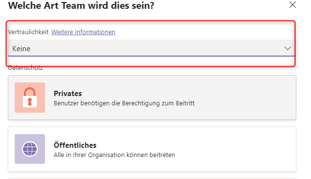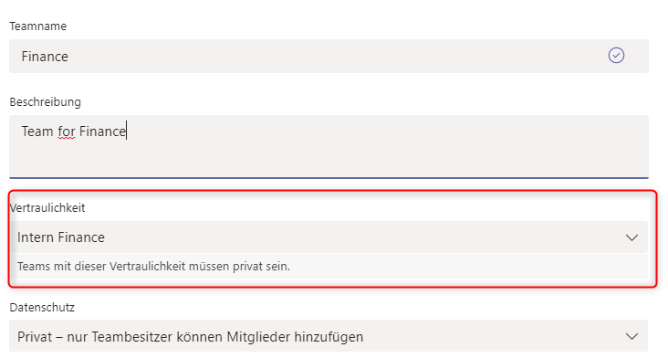 - Für eine gelabelte Gruppe können Sie den Datenschutz (öffentlich oder privat) vorgeben. Wenn Sie zum Beispiel ein Label Vertraulich konfigurieren und ein Benutzer wählt dieses aus, so kann er nur eine private Gruppe erstellen und keine öffentliche Gruppe. Natürlich müssen Sie dies während der Konfiguration mit angeben.