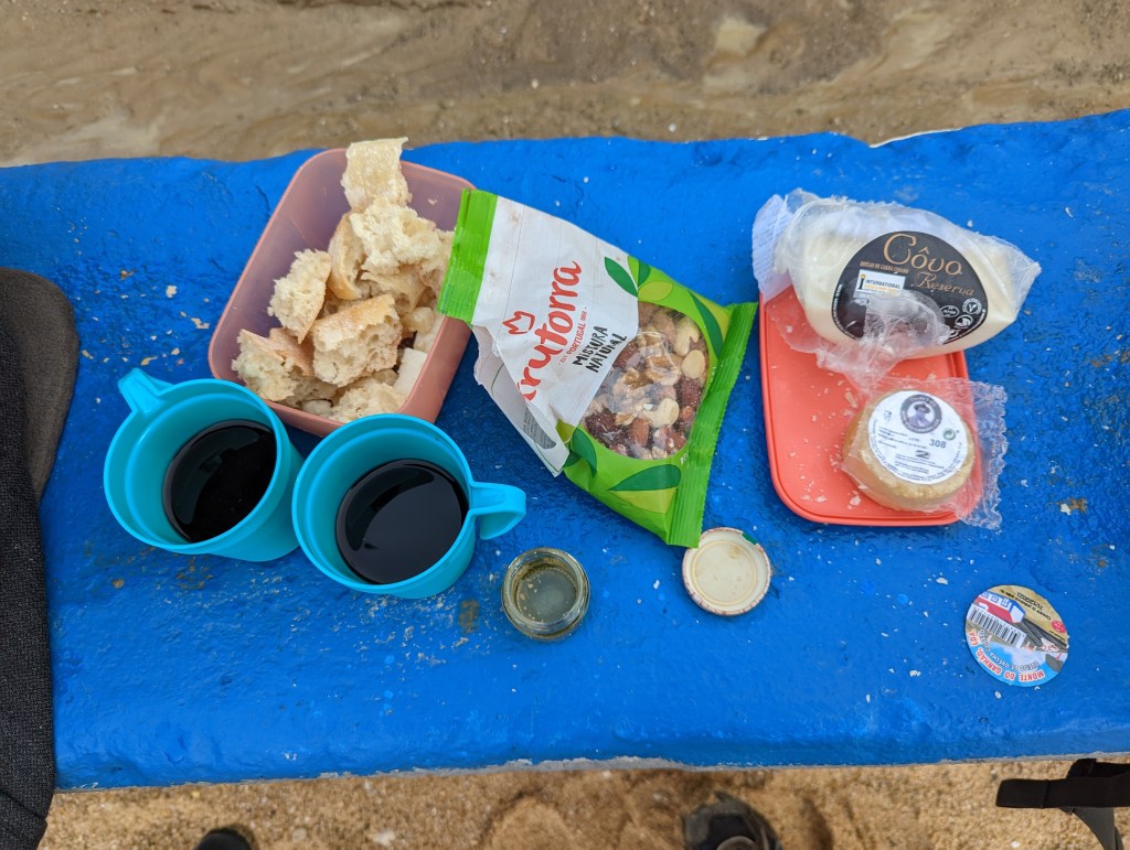 Sehr schön an Portugal ist der Wein und der Käse. Mittags haben wir einfach eine (halbe oder weniger) Flasche Rotwein mit Baguette, Käse und Oliven gegessen. Mehr braucht es da nicht.