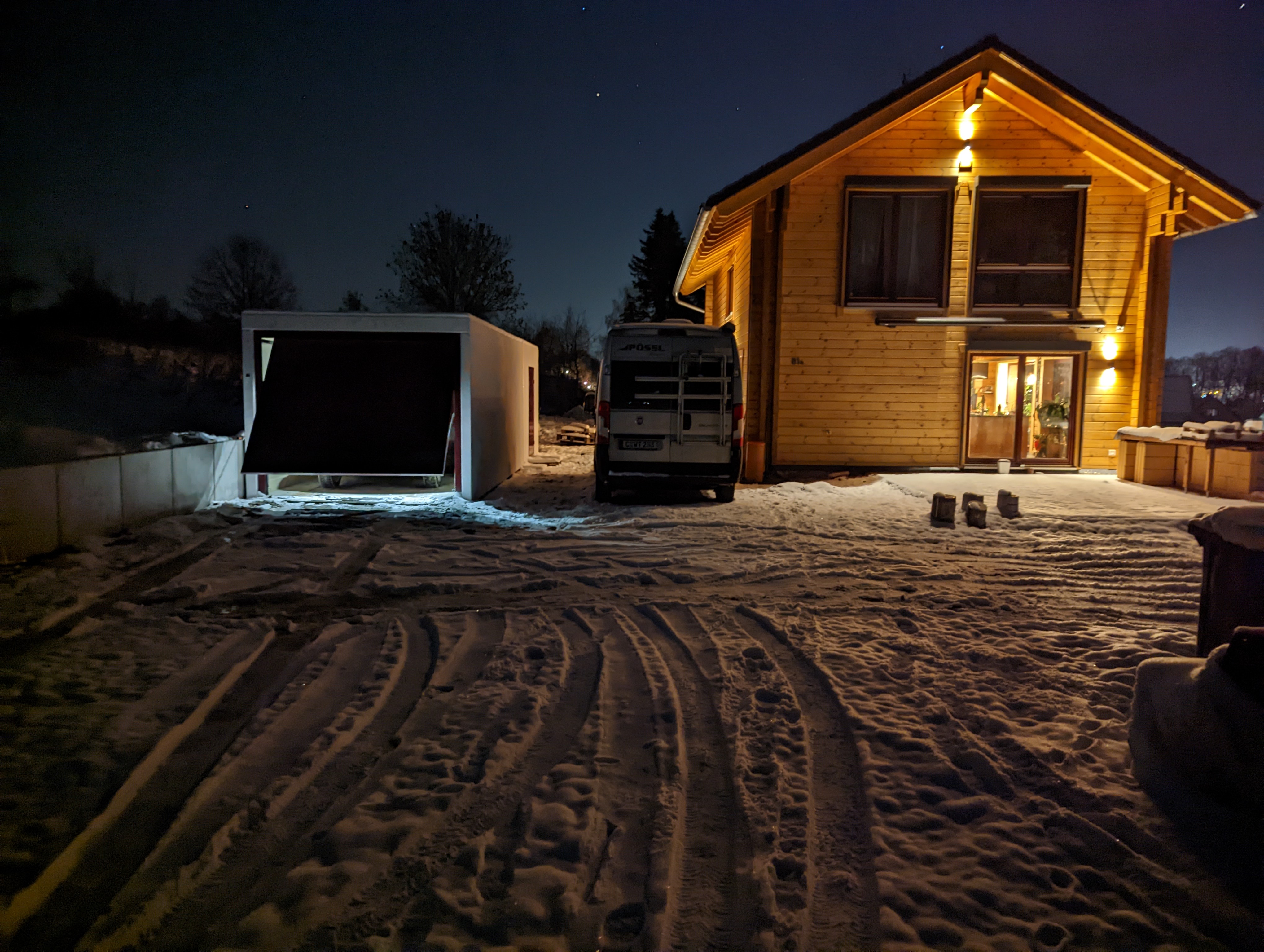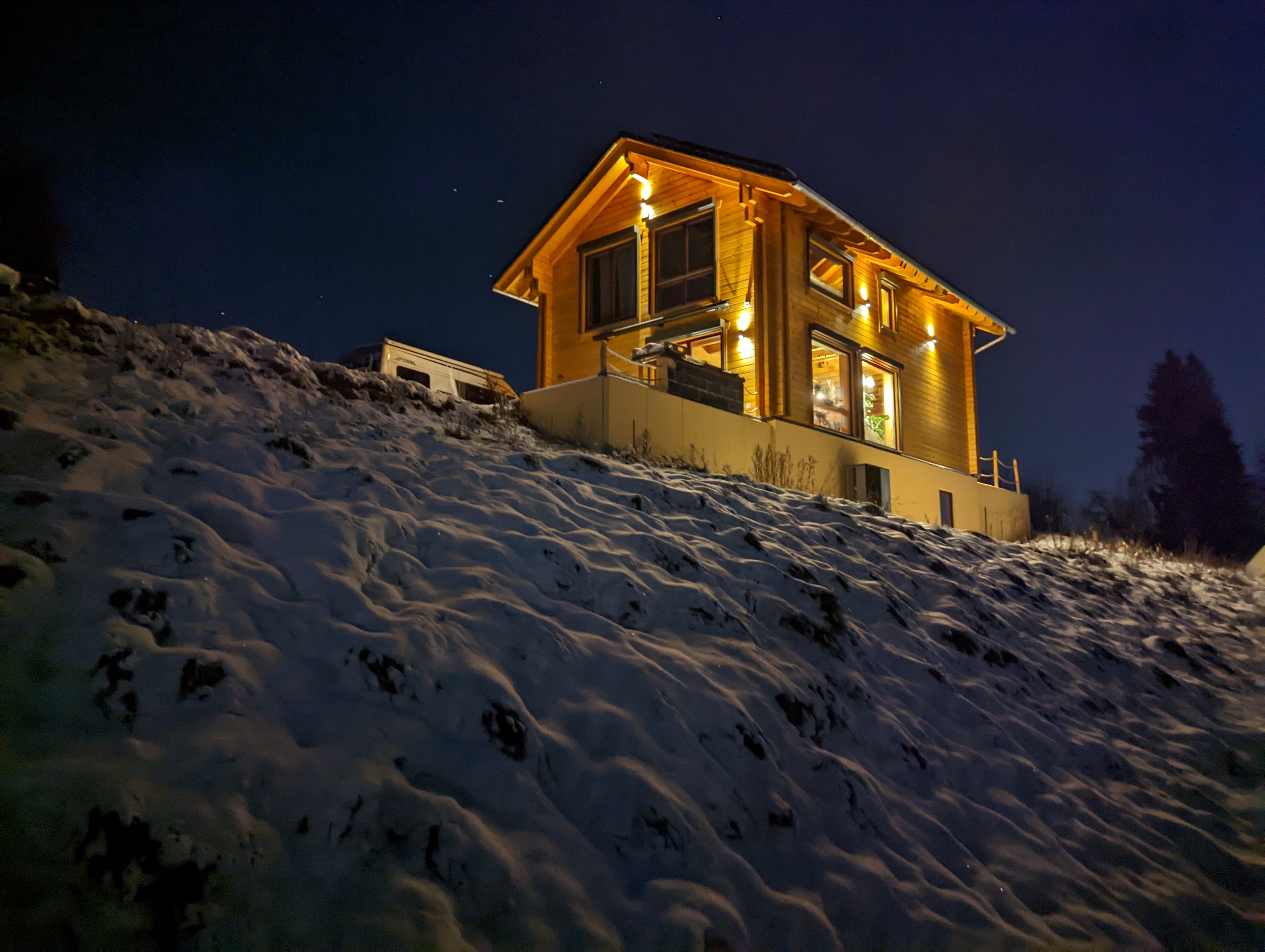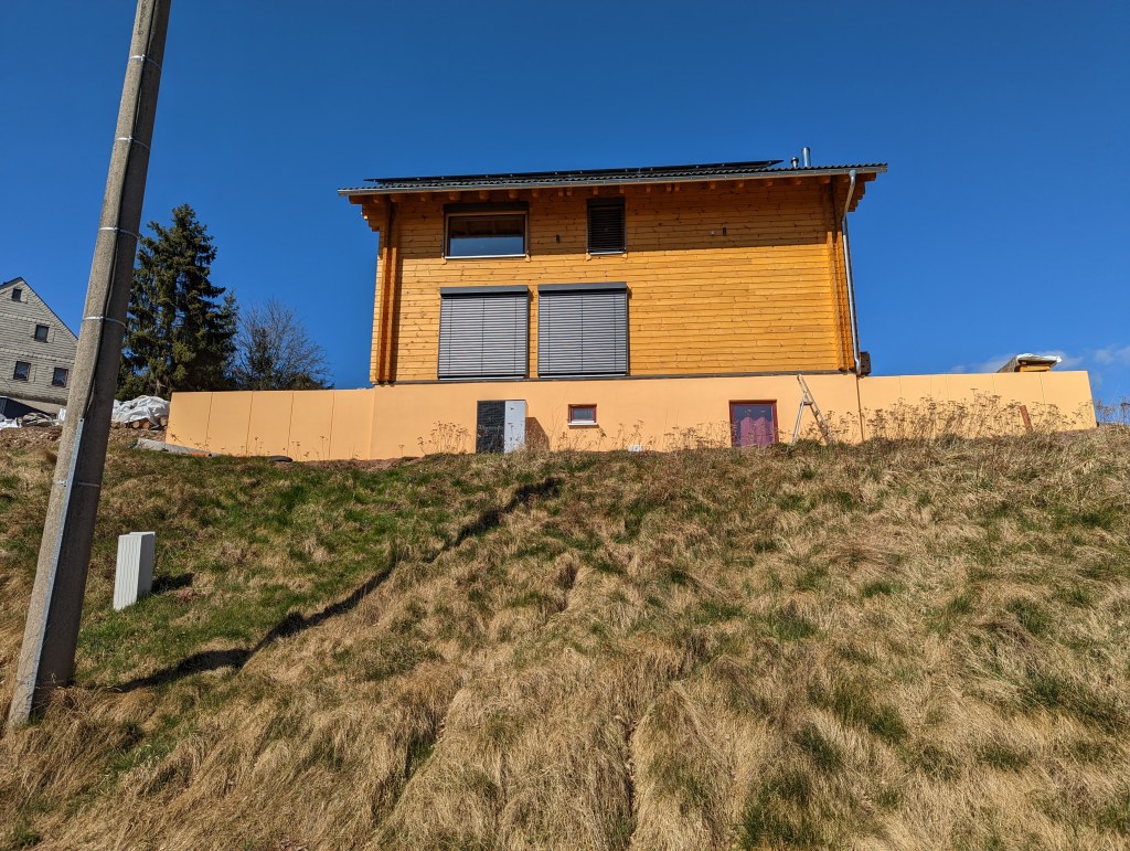 Für die Firma Erzholzhaus, die mir das Haus bauten, war ich der dritte Kunde. Und der erste, der einen Keller hatte und das Ganze als Smart Home realisierte. Auch hatten sie bisher keine vollständigen Blockhäuser gebaut, sondern immer nur die erste Etage als Block und der weitere Aufbau in Ständerbauweise. Alles hat hervorragend funktioniert, ich kann mich nicht beschweren.